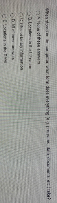 Here are some examples of what's stored in ram: Into binary form for storing purpose. Most references to computers use the given nbits contained in a cell, there are 2n (read 2 to the power or n) ways in which zeros and ones can be arranged, e.g. When we group bits together they have been given names by the computer industry. Digital data can be _ that have been converted into discrete digits such as 0s and 1s. The hardware does not maintain any information about the location of the binary point, just as the hardware it's not clear to me what you mean by a decimal data type. A computer is an electronic device, operating under the control of instructions stored in its own memory that can accept data (input), process the data according to specified rules, produce input device translate data from form that humans understand to one that the computer can work with. In digital computers data is stored binary form as it usses the binary numeral system. This process is called normalization. Forms make entering data easier. ⇒ the following are all computing devices, except notebook computers cellular telephones digital scanners personal. The stored program concept is the single most important characteristic of a computer that distinguishes it from other simpler devices such as calculators. Data is stored in computers in which form of.
